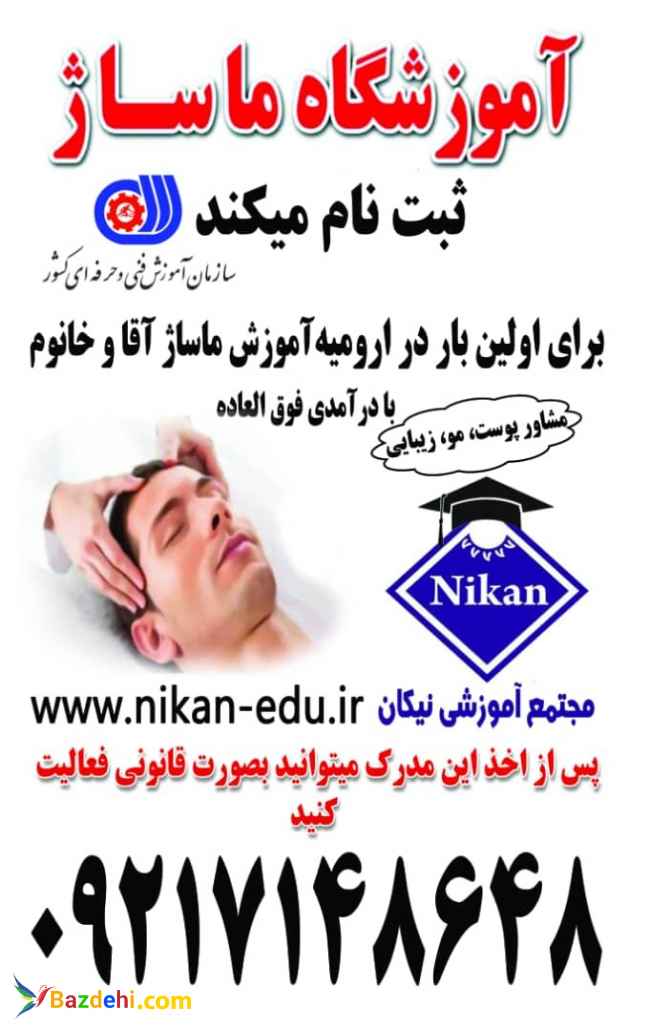 آموزشگاه ماساژ سازمان فنی وحرفه ای ثبت نام میکند آموزش دوره های کاربر ماساژ ،ماساژ سوئدی،ماساژ رفلکسولوژی و... فیزیوتراپی نوین یاد بگیرید وبصورت قانونی ومجاز فعالیت کنید ارئه پکیج ماساژ بصورت آنلاین وغیر حضوری جهت کسب اطلاعات بیشتر با 09217148648 تماس حاصل فرمایید فتر مرکزی ارومیه-خیابان برق 50 متر بالاتر از چهار راه عمار یاسر طبقه دوم شرکت نیکان www.nikan-edu.ir