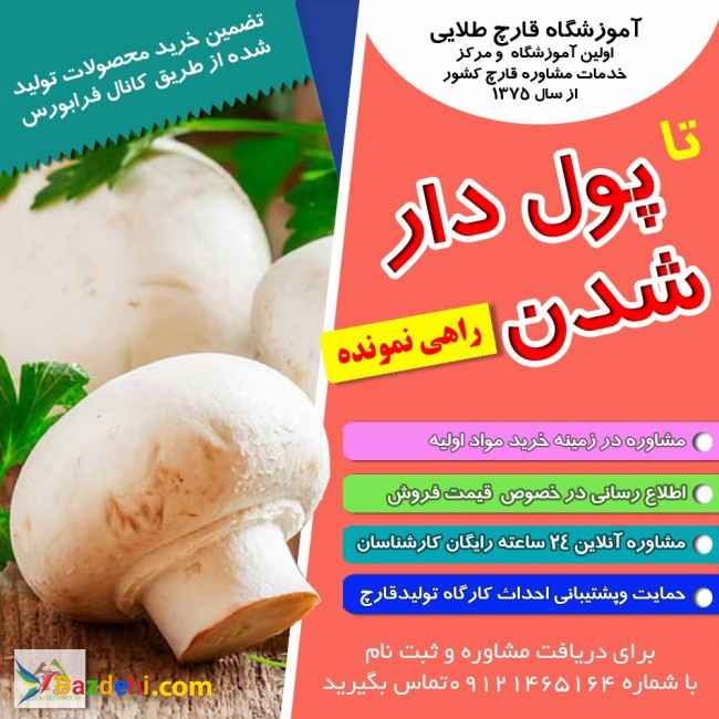 به نام خدا تولید قارچ یکی از پرسودترین مشاغل کشاورزی جزو تولیدات گلخانه ای بی نیاز به نور طبیعی است.حرفه پرورش دهنده قارچ یکی از مشاغل شناخته شده و دارای کد بین المللی تحت گواهینامه مهارت است و برای این رشته دیپلم مهارت فنی و حرفه ای صادر می گردد.طی سالهای اخیرتولید قارچ بعنوان شغلی سودآور شناخته شده و مورد توجه زیادی قرار گرفته و هم اکنون ایران یکی از صادر کننده گان مطرح قارچ در منطقه خاورمیانه محسوب می شود. در اطاق متروکه ، انباری، زیر زمین، حتی گوشه ای از یک پارکینگ امکان کاشت قارچ فراهم میباشد. برای دیدن نمونه از یک تولیدی کوچک با ما تماس بگیرید. طلوع طلایی اولین آموزشگاه ومرکزخدمات مشاوره قارچ کشور از 1375 مطابق با قوانین سازمان آموزش فنی و حرفه ای توسط کارشناسان رتبه خبره و تولید کننده نمونه باسابقه، با اجرای دوره های آموزشی کاملا علمی و عملی از تولید تا فروش همراه با مشاوره متوالی آماده انتقال فنون مدیریت و راه اندازی کسب و کار در رشته تولید قارچ به علاقمندان می باشد. هنر جویان دوره دیده در آموزشگاه طلوع طلایی پس از طی دوره آموزش تا دست یابی به استقلال شغلی از مشاوره رایگان و آنلاین ۲۴ ساعته کارشناسان متخصص و خبره آموزشگاه طلوع طلایی برخوردار خواهند شد. حمایت و پشتیبانی ما از هنرجویان در زمینه احداث و راه اندازی کارگاه تولید قارچ، مشاوره در خرید مواد اولیه، اطلاع رسانی در خصوص قیمت فروش , و تضمین خرید محصولات تولید شده از طریق معرفی به کانال فرابورس و توزیع کنندگان عمده قارچ در سراسر کشور می باشد.