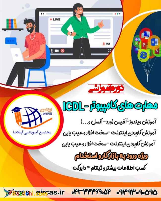 آموزش کامپیوتر در تبریز ، دوره ICDL در تبریز، تدریس تمام دوره های کامپیوتر برای تمامی سنین(افراد شاغل،کارمندان،دانشجویان،دانش آموزان و....)درآموزشگاه معتبر در تبریز تدریس مهارتهای هفتگانه ICDL به صورت تکی تدریس مهارت های هفتگانهICDL به صورت یکجا شامل: مبانیIT- ویندوز- اینترنت- ورد-اکسل- پاورپوینت-اکسس ارایه مدرک درون آموزشگاهی ،بین المللی،وفنی حرفه ای جهت ارائه به موسسات و ادارات دولتی و خصوصی برای استخدام تدریس کل دوره در یک هفته برای کسانی که برای استخدام به مدرک نیاز دارند. پرداخت شهریه به صورت تمام اقساط برای استعلام قیمت و زمانبندی دوره های آموزشی با کارشناسان این مجموعه تماس حاصل فرمایید. ICDLآموزش کامپیوتر-آموزش اکسس-آموزش اکسل در تبریز-آموزش اینترنت-آموزش پاورپوینت-آموزش ورد در تبریز-آموزش مهارت های رایانه در تبریز-آموزش رایانه-آموزش مهارت های هفت گانه-مدرک رایانه-مدرک کامپیوتر در تبریز-مدرک ICDL- در تبریز-گواهینامه ICDL در تبریز-آموزشگاه کامپیوتر در تبریز تماس: 04133369052 04133369053 04133369054 آدرس: شعبه یک:خ آزادی-خ جدیری جنوبی ساختمان 17 شعبه دوم:سه راهی طالقانی روبه روی مصلی وبسایت: Eircas.ir واتساپ و تلگرام :09393090595