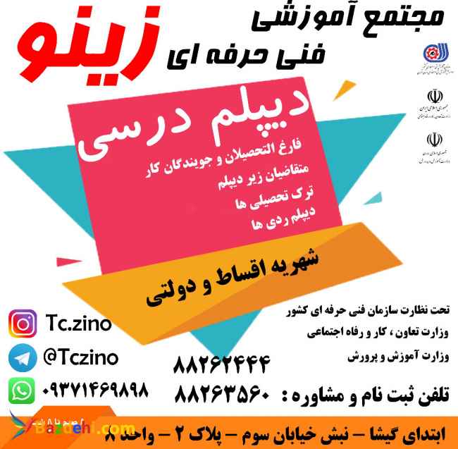 مجتمع آموزشی زینو با سابقه درخشان در زمینه آموزش شهریه دولتی و اقساط تحت نظارت سازمان فنی و حرفه ای کشور و سازمان آموزش و پرورش * سوم راهنمایی ها ، * دیپلم ردی ها. * بازماندگان از تحصیل ارائه دهنده کلیه مهارت های دیپلم در رشته های: کامپیوتر (طراحی وب،برنامه نویسی،تصویرسازی و...) حسابداری نقشه کشی مدیریت خانواده خیاطی گردشگری قالی بافی معماری صنایع غذایی و .... آدرس: گیشا (کوی نصر) ، نبش خیابان سوم، پلاک 2، واحد 8 تلفن ثبت نام و مشاوره: 09371469898 88262444