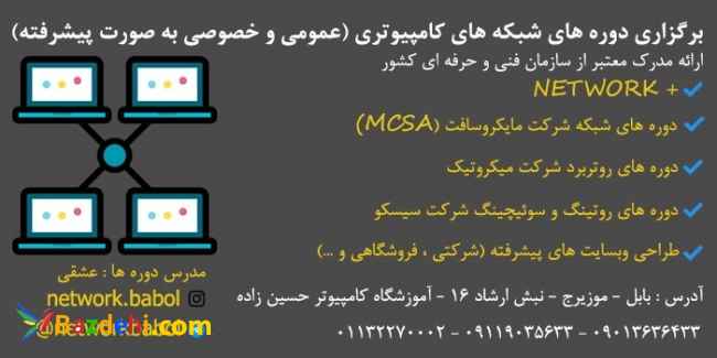 برگزاری دوره های آموزشی شبکه های کامپیوتری در مازندران ارائه مدرک معتبر از سوی سازمان فنی و حرفه ای کشور اینستاگرام : network.babol کانال تلگرام : networkbabol@ شماره های تماس: 09013636433 - 09119035633 - 01132270002 آدرس: بابل - موزیرج - نبش ارشاد 16 - آموزشگاه کامپیوتر حسین زاده
