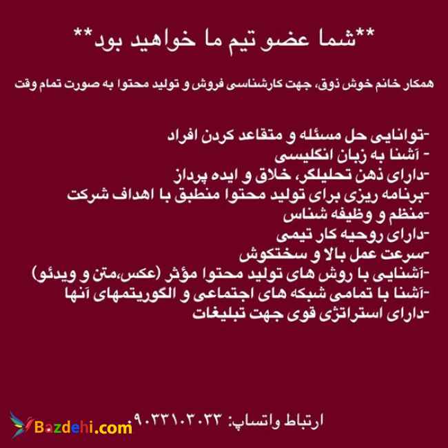 دعوت به همکاری همکار خانم خوش ذوق جهت کارشناسی فروش و تولید محتوا به صورت تمام وقت شما عضو تیم ما خواهید بود توانایی حل مسئله و متقاعد کردن افراد . آشنا به زبان انگلیسی در خواندن و نوشتن، دارای ذهن تحلیلگر، خلاق و ایدهپرداز، تولید محتوا برای صفحات مجازی برنامهریزی برای تولید محتوا منطبق بر اهداف شرکت منظم و وظیفه شناس دارای روحیه کار تیمی سرعت عمل بالا و سخت کوش آشنایی با روش های تولید محتوا موثر (عکس. متن. ویدیو) آشنا با تمامی شبکه های اجتماعی و الگوریتمهای آنها دارای استراتژی قوی جهت تبلیغات تلفن تماس :03132356964 شماره واتساپ:09033103033 آدرس :اصفهان خیابان طیب