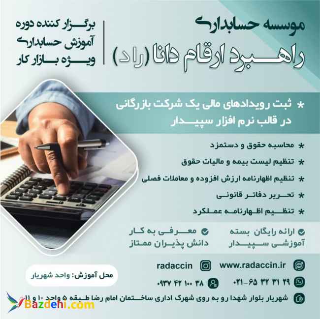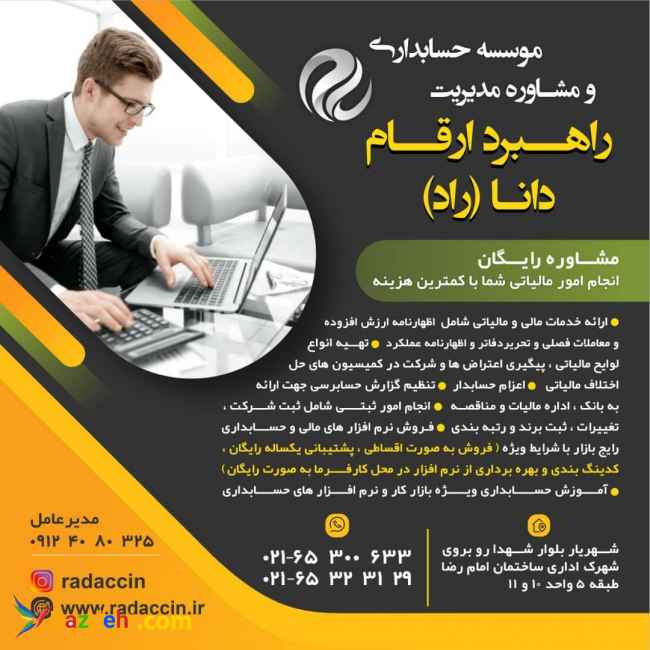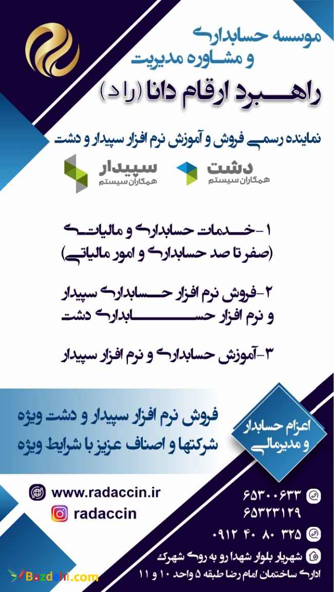 موسسه راهبرد ارقام دانا نماینده رسمی فروش نرم افزار سپیدار و دشت نماینده رسمی آموزش شرکت سپیدار سیستم 1_ارائه کننده خدمات حسابداری و مالیاتی انجام کلیه امور حسابداری و مالیاتی(پیاده سازی سیستم های مالی،تنظیم اظهارنامه ارزش افزوده و معاملات فصلی و تحریر دفاتر روزنامه و کل،تنظیم اظهارنامه عملکرد،شرکت در هیات های حل اختلاف مالیاتی) 2_فروش نرم افزار حسابداری سپیدار ویژه شرکت ها (بازرگانی،تولیدی،خدماتی،پیمانکاری) 3_فروش نرم افزار دشت ویژه اصناف(پوشاک،سوپر مارکت،آرایشی و بهداشتی،لوازم یدکی خودرو،ابزار و یراق آلات ساختمانی،قنادی و آجیل و خشکبار و ...) 4_اموزش حسابداری ویژه بازار کار ،نرم افزار سپیدار و حسابداری مقدماتی