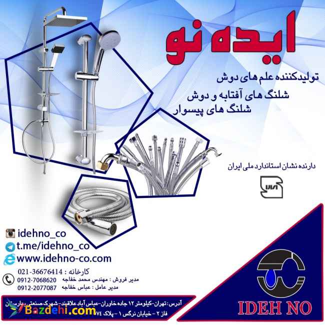 گروه تولیدی ایده نو ✔تولیدکننده علم های دوش ، شلنگ های آفتابه و دوش ، شلنگ های پیسوار، حصیری ، تکپایه و تنسو ✔دارنده نشان استاندارد ملی ایران تلفن کارخانه: ۳۶۶۷۶۴۱۴-۰۲۱ ۰۲۱-۳۶۶۷۶۴۱۶ مدیر فروش : مهندس محمد خفاجه ۰۹۱۲۷۰۶۸۶۲۰ مدیر عامل : عباس خفاجه ۰۹۱۲۲۰۷۷۰۸۷ آدرس: تهران.کیلومتر ۱۲ جاده خاوران.عباس اباد علاقبند.شهرک صنعتی بهارستان.فاز۲.خیابان نرگس۱.پلاک ۵۷۴ کانال تلگرام : t.me/idehno_co اینستاگرام : idehno_co آدرس سایت : . www.idehno-co.com ⭕لیاقتتان بهترین هاست⭕