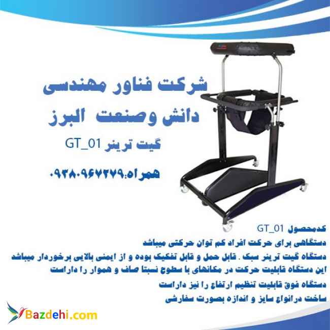 گیت ترینر GT-01 دستگاهی برای حرکت افراد کم توان حرکتی میباشد. دستگاه گیت ترینر سبک ، قابل حمل و قابل تفکیک بوده و از ایمنی بالایی برخوردار میباشد . این دستگاه قابلیت حرکت در مکانهای با سطوح نسبتا صاف و هموار را داراست . دستگاه فوق قابلیت تنظیم ارتفاع را نیز داراست.