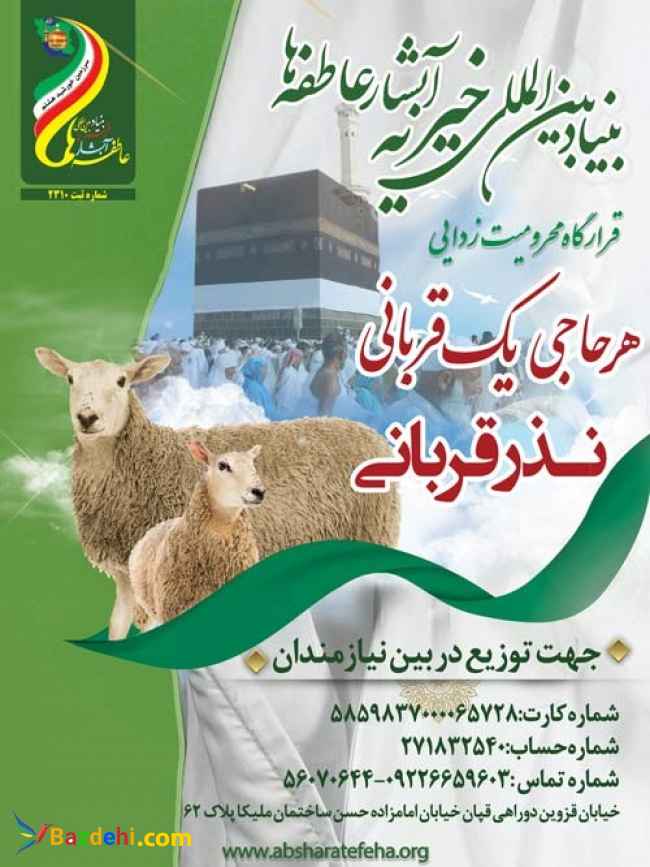 عید قربان با نماز و عبادتش، با ذکر و دعایش، با قربانى و صدقات و احسانش، بسترى براى جارى ساختن مفهوم عبودیت و بندگى است.قرارگاه محرومیت زدایی بنیاد بین المللی خیریه آبشار عاطفه ها در نظر دارد به مناسبت عید سعید قربان جهت خرید و توزیع گوشت در بین نیازمندان اقدام به جمع آوری نذورات شما می نماییم . شماره حساب:271832540 شماره کارت: 5859837000065728 شبا:680180000000000271832540
