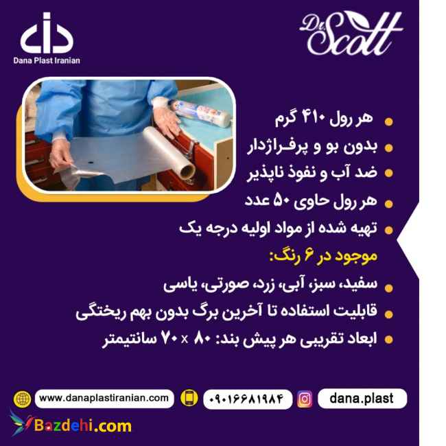 پیشبند رولی آنتی باکتریال: هر رول 410 گرم بدون بو و پرفراژ دار ضد آب و نفوذ ناپذیر هر رول حاوی 50 عدد تهیه شده از مواد اولیه درجه یک در 6رنگ : سفید سبز آبی زرد صورتی یاسی قابلیت استفاده تا آخرین برگ بدون بهم ریختگی ابعاد تقریبی هر پیشبند: 80*70 سانتیمتر