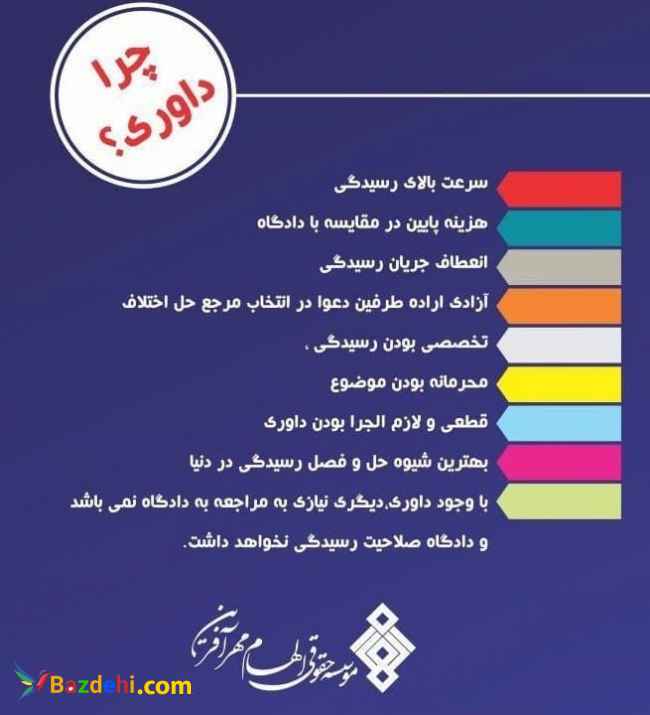 موسسه داوری عدالت پیشگان طلایی شریف ارائه دهنده خدمات داوری در امور بازرگانی، مالی، بانکی، خانواده، ثبتی، ملکی و ... داوری؟؟؟ _ بهترین شیوه رسیدگی به دعوای و حل و فصل اختلافات _ هزینه پایین در مقایسه با دادگاه _ سرعت بالای رسیدگی _قطعی و لازم الاجرا بودن رای داوری آدرس : -تهران - خیابان شهید بهشتی - نرسیده به خیابان قائم مقام - ساختمان 402- واحد 26 با مدیریت منصور خوشنویسان