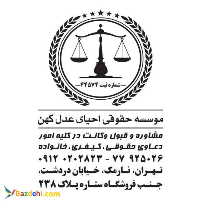 قبل از هر اقدام حقوقی با وکلای برتر تهران و قضات بازنشسته مشورت کنید *** خطوط ویژه : 02177925026 - 09120202823 (مشاوره حقوقی تلفنی رایگان است) * مشاوره و قبول وکالت در امور زیر مربوط به هموطنان ایرانی داخل و خارج از کشور بصورت تخصصی : * دعاوی خانوادگی شامل: مهریه ، اجرت المثل، تمکین، طلاق توافقی، طلاق یکطرفه ، استرداد جهیزیه، حضانت، ملاقات فرزند و غیره * دعاوی کیفری شامل: کلاهبرداری، خیانت در امانت، جعل، استفاده از سند مجعول، توهین، افترا، آدم ربایی، مزاحمت، ممانعت از حق ، ورود غیرقانونی و به عنف، ارتشاء ، اختلاس، تصرف عدوانی، دیه، تصادفات، ترک انفاق، و غیره * دعاوی حقوقی شامل: دعاوی مشارکت در ساخت ، قراردادها ، چک و سفته، مطالبه وجه، مطالبه خسارات، فسخ معامله ، اجاره ، تحریر و تقسیم ترکه، اخذ گواهی انحصار وراثت، الزام به انجام تعهد، الزام به تنظیم سند رسمی، الزام به تحویل آپارتمان و ملک و غیره * امور حسبیه شامل : تغییر نام ، تغییر سن ، محجوریت ، نصب قیم ، حکم رشد ، مهر و موم ترکه ، تحریر ترکه ، عزل قیم ، وصیت ، اخذ گواهی انحصار وراثت ، و غیره * ساعات کار موسسه حقوقی احیای عدل کهن : 11 الی 19 (شنبه تا پنج شنبه) * نشانی : تهران نارمک دردشت جنب فروشگاه ستاره پلاک 238 *** خطوط ویژه : 02177925026 - 09120202823 (مشاوره حقوقی تلفنی رایگان است)