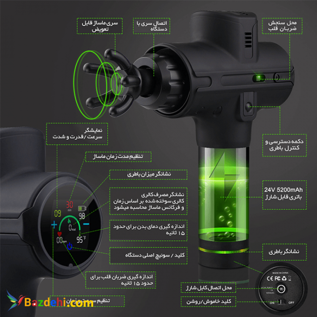نام:ماساژور تفنگی برند:سایکل تیری Cycle tree مدل :MG-02 قابلیت استفاده:خانگی/سالن های ورزشی /فیزیوتراپی / سالنهای ماساژ جنس و مواد ساخت:آلیاژ آلومینیوم + PP + ABS مواد سر ماساژور:PP + EVA محدوده سرعت:1800-3500 دور در دقیقه تعداد سرعت:9 سرعت قابل تنظیم صفحه نمایشگر:LCDلمسی نوع باتری:باتری لیتیوم با انرژی بالا قابل جدا شدن ظرفیت باتری:قابل شارژ5200mAh زمان شارژ:3-4 ساعت زمان کار:حدود8 ساعت
