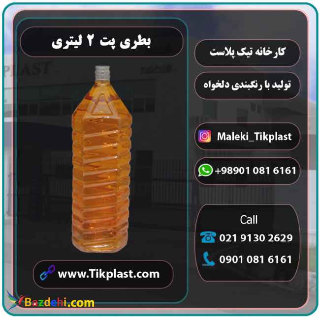 کارخانه تیک صنعت پلاست طراح یکی از تولید کنندگان مطرح و به نام در صنعت بزرگ پلاستیک و بسته بندی است و خط تولید بسیار پیشرفته و مجهزی دارد. این کارخانه تولید کننده انواع بطری پت است و تنوع بسیاری در بطری های پت دارد و مصرف کنندگان این ظروف می توانند به راحتی محصول مورد نیاز خود را پیدا کنند.بطری پت 2 لیتری با توجه به اینکه ظرفیت استاندارد و متوسطی دارد در بسیاری از موارد مورد استفاده قرار می گیرد. از بطری دو لیتری پت پلاستیکی برای نگه داری و بسته بندی انواع روغن و مایعات خوراکی یا غیر خوراکی می توان استفاده کرد. بطری پلاستیکی 2 لیتری کتابی شکل است و دارای چهار گوش می باشد که باعث شده بطری ظاهر شکیل تری داشته باشد. همچنین شیار هایی که بر روی این بطری ایجاد شده است ضمن حمل و نقل آسان تر به زیباتر دیده شدن ظاهر بطری کمک می کند.قیمت بطری دو لیتری با توجه به سایز دهانه بطری ، وزن بطری و رنگ و مواردی از این قبیل تغییر پیدا می کند ، اما با توجه به اینکه کارخانه تیک پلاست مستقیما فرآیند تولید و فروش این محصول را انجام می دهد ، نازل ترین قیمت را برای فروش این محصول در نظر می گیرد. خرید بطری پت پلاستیکی خالی قیمت بطری دو لیتری بطری 2 لیتری پت بطری پلاستیکی 2 لیتری قیمت بطری دو لیتری بطری اب 2 لیتری بطری 2 لیتری پت قیمت بطری پلاستیکی 2 لیتری تولید کننده بطری پلاستیکی بطری پلاستیکی 2 لیتری برای خرید بطری پت شفاف 2 لیتری در تهران ، کرج ، اصفهان ، شیراز ، اهواز ، مشهد ، یزد ، کرمان ، کرمانشاه ، مازندران ، گیلان ، بندر عباس ، زاهدان ، ایلام ، تبریز ، ارومیه ، اردبیل و سایر شهر ها برای اطلاع بیشتر در رابطه با قیمت محصولات با شماره های زیر تماس بگیرید. 09355131323 مدیر فروش 02191302629 خط ثابت