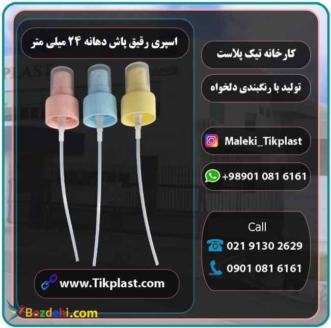 کارخانه تیک صنعت پلاست یکی از تولید کنندگان برتر انواع ظروف پلاستیکی است که با بیش از یک دهه فعالیت و سابقه مستمر در عرصه پلاستیک موفق شده تا محصولات بسیار گوناگونی تولید نماید. پمپ اسپری رقیق پاش دهانه 24 یکی از درب های بطری بسیار کاربردی و پرمصرف است که به عنوان درب اسپری بر روی انواع بطری های پلاستیکی دهانه 24 میلی متر نصب می شود. اسپری رقیق پاش دهانه 24 با رنگبندی متنوعی تولید می شود و مشتریان می توانند این محصول را با رنگ دلخواه سفارش دهند. از پمپ اسپری رقیق پاش به عنوان پمپ اسپری الکل و سایر محلول های رقیق و انواع روغن و ... مورد استفاده قرار می گیرد. برای خرید اسپری رقیق پاش درجه 1 و با کیفیت کافی است با شماره های موجود تماس بگیرید و پس از ثبت سفارش پمپ اسپری دهانه 24 را در بهترین کیفیت و با تعداد مورد نظر تحویل بگیرید. پمپ اسپری الکل والف رقیق پاش قیمت والف اسپری خرید اسپری رقیق پاش دهانه 24 اسپری رقیق پاش اصفهان تولید کننده پمپ رقیق پاش پمپ رقیق پاش درب اسپری پاش برای خرید انواع پمپ اسپری رقیق پاش دهانه 24 میلی متر در شهر های مشهد ، اصفهان ، تهران ، کرج ، شیراز ، کرمانشاه ، اهواز ، زاهدان ، بوشهر ، خوزستان ، تبریز ، ارومیه ، گرگان و ... با شماره های موجود فقط تماس حاصل نمایید. آدرس کارخانه : کرج ، هفت جوی ، شهرک صنعتی زرین دشت مدیر فروش : 09021613823