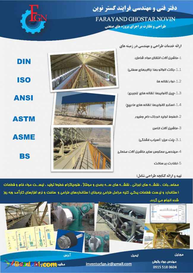 این دفتر با سابقه کاری بیش از پانزده سال در زمینه طراحی و نظارت برساخت تجهیزات و ماشین آلات انتقال مواد از قبیل باکت الواتور (بالابر سطلی) ، نوار نقاله ، چین کانوایر (نقاله زنجیری) ، اسکرو کانوایر (نقاله مارپیچ) و خطوط تولید خوراک دام و طیور با ظرفیتهای متنوع تاکنون پروژه های مختلفی با ظرفیتهای متنوع طراحی و نظارت دراجرای آن را عهده دار بوده است.