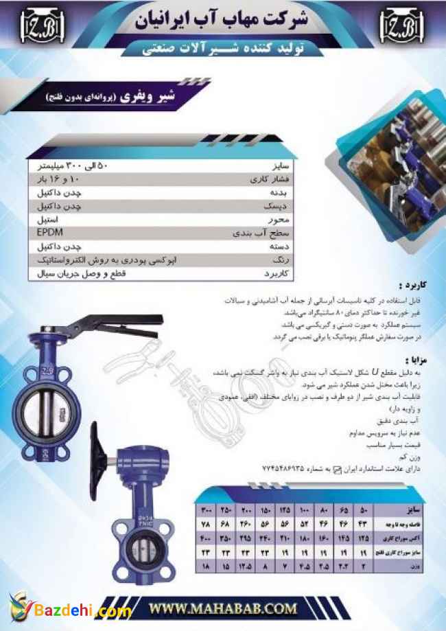 شرکت مهاب آب ایرانیان تولیدکننده شیرآلات صنعتی کاربرد • مناسب برای قطع و وصل جریان سیال • جایگزین برای شیرهای توپی و کشویی • قابل استفاده برای سیالات غیر اسیدی • دارای قابلیت نصب عملکرد های مختلف : اهرمی _گیربکسی _پنوماتیک و برقی مزایا: دو سال گارانتی...ده سال خدمات پس ازفروش دارای نشان استاندارد ایران و طراحی شده بر اساس استاندارد های DIN مشخصات فنی : فشار کاری : 10 بار و 16 بار سایز : 50 الی 300 میلیمتر جنس بدنه : چدن داکتیل جنس محور : استنلس استیل و فولاد جنس زبانه : چدن داکتیل دمای کاری : 10 الی 90 درجه سانتی گراد رنگ : اپوکسی پودری به روش الکترو استاتیک
