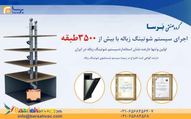 گروه صنعتی برسا تولید کننده :سیستم شوتینگ زباله ، دریچه های تنظیم هوا ، دمپر های بین کانالی ،کانال انتقال هوا،دودکش فولادی موتورخانه کارخانه ۷_۰۲۱۶۵۶۸۴۵۶۴ واحد فروش ۹_۰۲۱۶۶۰۸۰۳۷۶ فنی وفروش ۰۹۱۲۳۲۶۵۳۵۸ شماره تلگرام ۰۹۲۱۸۹۴۵۴۳۱