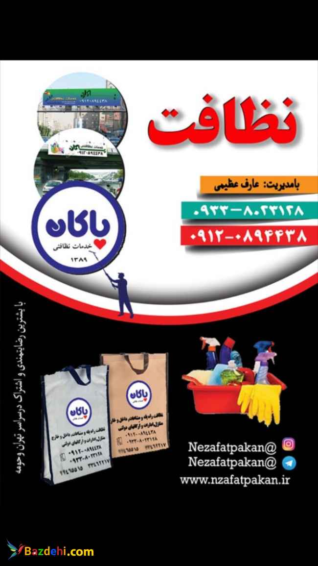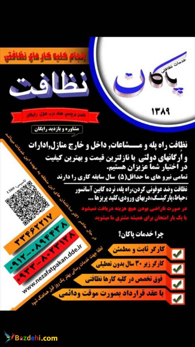 خدمات نظافتی پاکان سراسر تهران خدمات نظافتی پاکان کادر خانم و آقا در سراسر تهران ✔با عقد قرار داد ب صورت مکتوب ♻️خصوصیات نیروهای خدمات پاکان نیروی قابل اطمینان نیروی نظافتی با اخلاق نیروی نظافتی با ظاهر آراسته و بهداشت شخصی نیروی نظافتی وقت شناس نیروی نظافتی آموزش دیده و داشتن سابقه کار ✅انجام تمامی کار های نظافتی نظافت راه پله: (راه پله.نرده.کلید پریز. کابین آسانسور.درب های آسانسور .پنجره ها .پارکینگ .حیات .درب های ورودی کندن برچسپ های درب منزل. شستن پادری ها. دربهای آسانسور .تمیز کردن اف اف و...) ✔"همه اینها شامل نظافت راه پله میشود"✔ نظافت داخل واحد (دیوار ها درب ها .شیشه .پنجره سرویس های بهداشتی . درب ها . ودیوار ها . آشپز خانه ) و ... ✔نیروی ثابت و مطمئن با رضایت کامل شما کیفیت را از هر جهت تضمین میکنیم ☝☝☝☝☝☝☝☝☝☝☝☝☝☝☝☝☝ در صورت ناراضی بودن هیچ وجه در یافت نمیشود شماره های تماس ۳۶۴۶۹۷۴۲☎ ۰۹۱۲۰۸۹۴۴۳۸ ۰۹۰۳۵۰۷۷۹۴۵ ۰۹۱۲-۰۸۹۴۴۳۸ مدیریت : آقای عظیمی