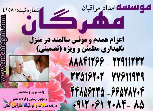 تماس سریع با کارشناسان موسسه مهرگان : 77611995 - 77611998 88841266 - 88841254 22912147 - 22911232 66578712 - 66578704 44856235 - 44856229 33516202 - 33511609 77611960 - 77611939 موسسات دیگر از اعتبار قدمت و برند موسسه ما سوء استفاده می کنند مراقب باشید و به هر موسسه ای اعتماد نکنید. با برترین و موفق ترین موسسه حال حاضر ایران سلامت جسمی ، روانی و اجتماعی سالمندانتان را بخواهید پیری کاهش قوای روانی و جسمی است که در اثر گذشت زمان روی می دهد. امروزه که غالب سالمندان به تنهایی در خانه خود به سر می برند، هر قدرهم که وضع زندگی آنها خوب باشد از توجه عاطفی دیگران و اقدامات جامعه بی نیاز نیستند. موسسه مهرگان به شماره ثبت 41580 و شناسه ملی 14006754273 بزرگترین و معتبرترین موسسه مراقبتی در ایران با سالها سابقه درخشان و پربار ، دارای مجوز رسمی و قراردادهای معتبرو تضمینی و گواهینامه های معتبرو متعدد بین المللی که پس از آزمونهای مکرر و بررسی توسط کنسرسیومهای اعتبارسنجی و ارزشیابی و پژوهشکده دانشگاهی سنجش مدیران و آکادمی بین المللی R.S.I موفق به دریافت آنها شده است ، از جمله : گواهینامه DNW اتریش گواهینامه High level WTG اتحادیه اروپا مدرک بین المللی NOBEL1 و دارنده استانداردهای جهانی: ISO 9001 برای مدیریت و کنترل کیفیت ISO 10001 برای رضایتمندی مشتری ISO 10002 برای رسیدگی به شکایات مشتریان ISO 26000 برای مسئولیت اجتماعی سازمان ها می باشد و مفتخر به دریافت: تندیس و لوح واحد نمونه کشوری تندیس کارآفرین برتر کشور تندیس نیکوکار منتخب استان لوح مدیریت برگزیده و ده ها تقدیرنامه و دست نوشته های فراوان از کارفرمایان موسسه مهرگان با بهره مندی از پرسنل تحصیلکرده ، آموزش دیده و مورد اطمینان به عنوان اولین موسسه مراقبت و نگهداری قابل اعتماد با خدمات ویژه و تضمینی سالمندان که کلیه خدمات را با کیفیت بسیار بالا وبهترین قیمت ممکن در کوتاه ترین زمان در سطح ملی ارائه می دهد. موسسه مهرگان به پاس خدمات ارزنده و شایسته مفتخر به کسب رتبه نمونه کشور در حوزه مراقبت و نگهداری سالمند در منزل می باشد که با توجه به برنامه ریزیها و تدابیر حمایتی از سالمندان ، در طی سالیان اخیر توانسته است همواره با جلب رضایت کارفرمایان ، کارنامه زرینی را در خاطر و اذهان عمومی ثبت نماید. خدمات یکپارچه و ده گانه با پشتیبانی و پاسخگوئی 24 ساعته و ارزیابی مداوم سرویسهای ارائه شده و عملکرد پرسنل اعزامی در کنار تیم هماهنگی و برنامه ریزی مجرب جهت ارائه مشاوره و راهنمایی به کارفرمایان محترم و در راس امور مدیریت مدبر و متعهد بیانگر شایستگی و کارآمدی موسسه مهرگان می باشد. موسسه مهرگان واحد منتخب کشوری و وابسته به هلدینگ حامی پارس ، اولین هلدینگ فوق تخصصی مراقبتهای بالینی در ایران با جامع ترین و ممتازترین خدمات مراقبتی می باشد. باموسسه مهرگان حس اعتماد را تجربه کنید مراحل ده گانه خدمات شایسته ودرشأن مشتری از سفارش تا نحوه انجام آن توسط موسسه مهرگان به طور خلاصه به شرح ذیل میباشد. مرحله اول : تماس با مشاوران موسسه مهرگان وثبت سفارش درخواست. مرحله دوم : اعزام کارشناس به موقعیت خدمات گیرنده و کارشناسی و تعین قیمت و گزارش آن به مشاور مربوطه. مرحله سوم : اعزام مراقب از طرف موسسه و مصاحبه کارفرما با وی . مرحله چهارم : انتخاب مراقب توسط کارفرما و شروع به کارآزمایشی ایشان با حقوق. مرحله پنجم : در صورت رضایت کارفرما عقد قرارداد با موسسه مهرگان مرحله ششم : انجام امورات محوله توسط مراقب انتخابی طبق شرایط و ضوابط قرارداد. مرحله هفتم : ارزیابی مداوم ازعملکرد مراقب توسط سامانه هوشمند موسسه. مرحله هشتم : بازدید ناگهانی توسط بازرسین موسسه وارزشیابی و ساماندهی عملکرد پرسنل. مرحله نهم : تعویض پرسنل به درخواست کارفرما وصلاحدید موسسه. مرحله دهم : حق با مشتری است و رضایت مندی ایشان به هر نحوی باید حاصل شود. هسته گزینش و استخدام موسسه امداد مراقبان مهرگان باتوجه به حساسیت خانواده های محترم نسبت به گزینش و بررسی صلاحیت و احرازهویت پرسنل استخدامی به شدت سخت گیری می نما