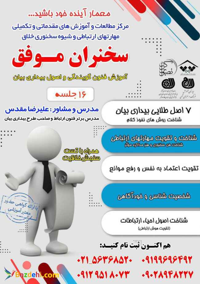 آموزش 7 اصل طلایی بیداری بیان (شناخت روش های نفوذ کلام) شناخت و تقویت مهارتهای ارتباطی (شناخت فن سخنوری و هنر مذاکره موثر) تقویت اعتماد به نفس و رفع موانع (شخصیت شناسی و خودآگاهی) شناخت اصول احیاء ارتباطات(تقویت هوش ارتباطی) 16 جلسه / با ارائه گواهی معتبر آموزشی مدرس و مشاور : استاد علیرضا مقدس جهت ثبت نام با شماره ذیل در ارتباط باشید : 02156368520 & 09028948227