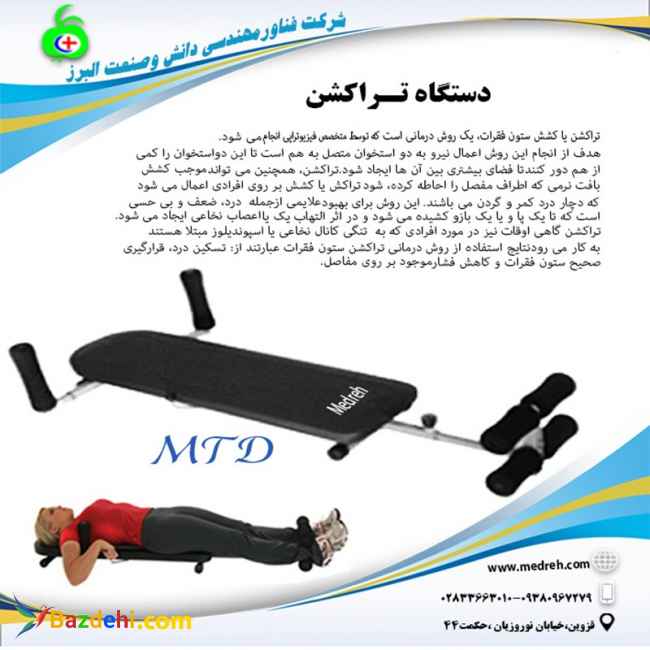 دستگاه تراکشن یا کشش ستون فقرات تراکشن یا کشش ستون فقرات، یک روش درمانی است که توسط متخصص فیزیوتراپی انجام می شود. هدف از انجام این روش اعمال نیرو به دو استخوان متصل به هم است تا این دو استخوان را کمی از هم دور کنند تا فضای بیشتری بین آن ها ایجاد شود. تراکشن، همچنین می تواند موجب کشش بافت نرمی که اطراف مفصل را احاطه کرده، شود تراکش یا کشش بر روی افرادی اعمال می شود که دچار درد کمر و گردن می باشند. این روش برای بهبود علایمی ازجمله درد، ضعف و بی حسی است که تا یک پا و یا یک بازو کشیده می شود و در اثر التهاب یک یا چند ریشه ی اعصاب نخاعی ایجاد می شود. تراکشن گاهی اوقات نیز در مورد افرادی که به تنگی کانال نخاعی یا اسپوندیلوز مبتلا هستند به کار می رود. نتایج استفاده از روش درمانی تراکشن ستون فقرات عبارتند از: تسکین درد، قرارگیری صحیح ستون فقرات و کاهش فشار موجود بر روی مفاصل. id تلگرام:https://t.me/khosro_chatranbarin برای کسب اطلاعات بیشتر با شماره های زیر تماس حاصل فرمایید. همراه:09380967279 instagram.com /medreh.co این آدرس ایمیل توسط spambots حفاظت می شود. برای دیدن شما نیاز به جاوا اسکریپت دارید ایمیل http://WWW. Medreh.ir