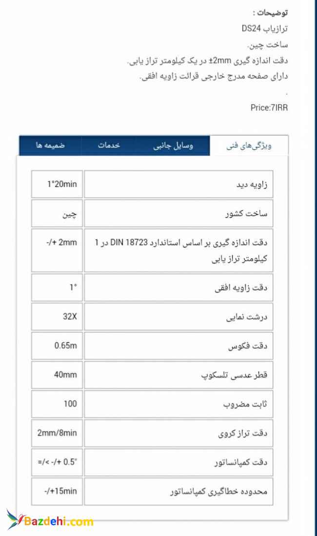 دوربین تراز یاب فوق العاده دقیق و کاربردی با قاب محافظ مستحکم ، در حد نو، بسیار متناسب در حمل و جابجایی، خوش دست و سبک ، از بهترین برند چینی،همتراز مشابه آلمانی. که این نوع مدل بسیار کمیاب بوده ،فقط به خاطر همتراز بودن با مشابه آلمانی بسیار پر فروش است. پایه آن موجود نیست. و بدون پایه با قیمتی مناسب به فروش میرسد. سالم و دقیق بوده و از ویژگیهای بارز این دوربین زوم فوق العاده قوی و وضوح عالی این دوربین میباشد.قیمت در djکالا 3/400/000تومان است اما  به دلیل نیاز مالی با قیمت پایین به فروش گذاشتم. و به خاطر استفاده اندک از آن در حد نو میباشد. قیمت فقط /2/200/000ولی هزینه ارسال به آدرس خریدار  به عهده خریدار است. یاعلی.