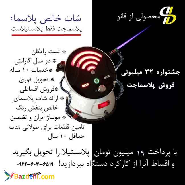 جشنواره فروش بهاره پلاسما جت، پلاسینتیلا 1-تست رایگان 2-دو سال گارانتی بی قید و شرط 3-تحویل فوری 4-فروش اقساطی 5-ارايه شات پلاسمای خالص، بنفش رنگ 6-مونتاژ ایران و تضمین تامین قطعات به مدت 10سال جشنواره فروش 32 میلیون تومانی پلاسینتیلا با پرداخت 19 میلیون تومان دستگاه را تحویل گرفته و اقساط آن را از کارکرد دستگاه بپردازید. تماس جهت مشاوره و خرید: 6519-603-0922