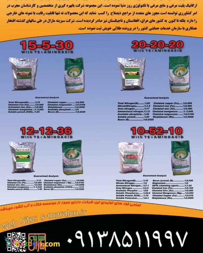 09138511997خانم شاکری واحد فروش مستقیم کارخانجات تولیدی سبزینه مارال یزد?تولیدکننده انواع کود شیمیائی? ارگانیک(آلی)?و معدنی? به فرمهای گرانول✅مایع✅پودری✅پلیت✅ دارای پروانه بهره برداری ۵۲۵۵ ✅ دارای مجوز محصولات از موسسه آب و خاک کشور ✅ تاییدیه وزارت جهاد کشاورزی✅دارای مجوز وزارت صنعت ، معدن ، تجارت✅واحد تحقیق و توسعه -آزمایشگاه آب و خاک ( کنترل کیفیت ) -معدن اختصاصی لئوناردیت بهترین کیفیت کود های کشاورزی را عرضه می نماید 36-12-12: ✅ عناصر نیتروژن، فسفر و پتاسیم متعادل. ✅ دانه بندی مطلوب و با ثبات. ✅ حلالیت بالا. ✅ بدون فشرده گی، پودر یا کلوخه. ✅ حمل امن، راحت و آسان. ✅ 100 % بدون ناخالصی و کلر. ✅ تحریک کننده رشد و نمو. ✅ بهبود اندازه میوه. ✅ افزایش تولید و افزایش کیفیت میوه.
