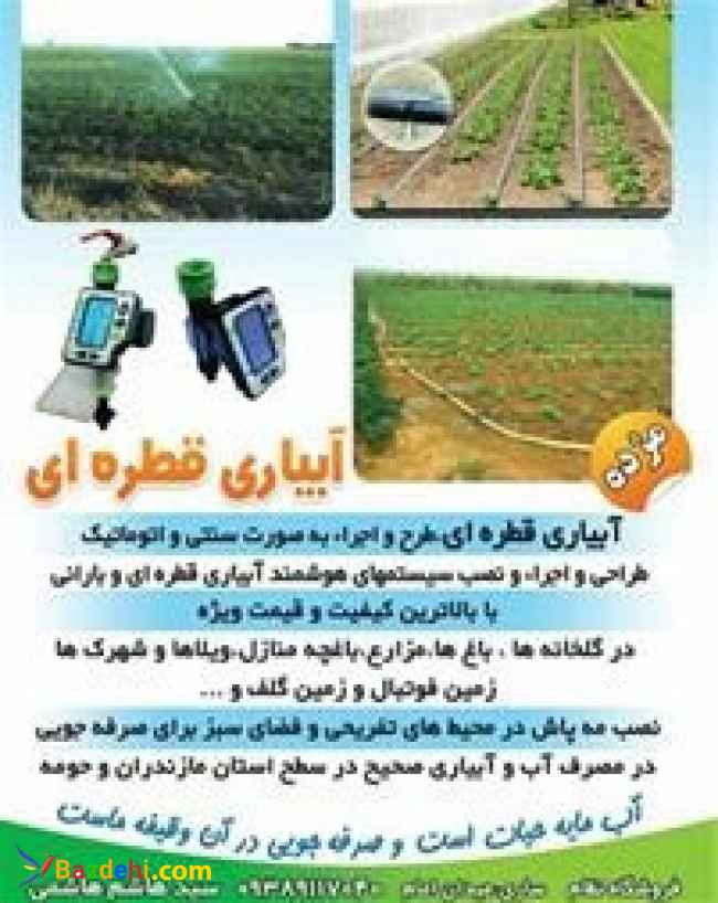 طراحی و اجرای آبیاری قطره ای هوشمند و نصب انواع مه پاش در کلیه شهرهای استان مازندران و شهرهای ساحلی مانندساری، نوشهر، چالوس، محمودآباد، نور و رویان و .... قابل اجرا در باغچه منازل، ویلاها و شهرک ها و فضاهای سبز شما نصب انواع مه پاش صنعتی، نیمه صنعتی و خانگی شماره همراه دیگر 09111525196 ابيارى قطره اى