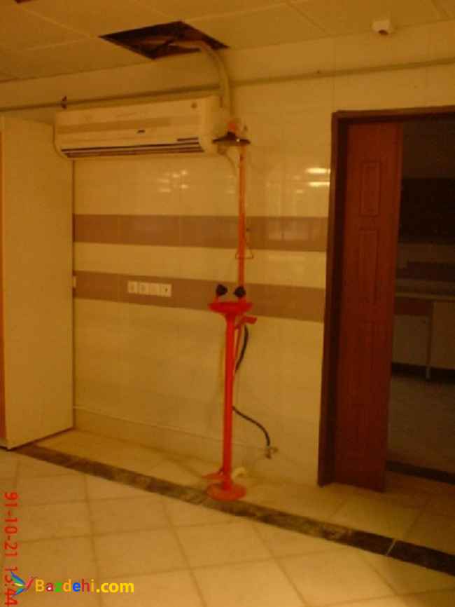 چشم شوی متصل به دوش دارای دو نازل شستشو دهنده و حفاظ چشمی لاستیکی از نوع نرم باید داشته باشد . و آب آن درون ظرفی ریخته شود و به سیستم فاضلاب منتقل گردد .