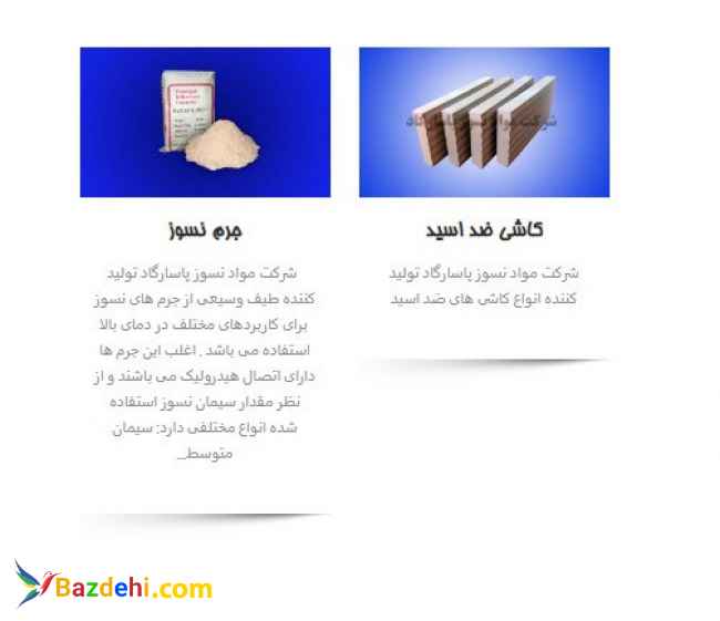توليد کننده انواع مواد نسوز ويژه صنايع فولاد و ريخته گري، صنايع کاشي و سراميک، صنايع شيميايي و پتروشيمي توليدات اين مجموعه عبارتند از : 1- جرم هاي کوبيدني سيليسي (با خلوص 99.5%) و اسپينلي کوره هاي القايي ذوب فولاد و چدن 2- سيمان کويل ( Grout Coil) با خلوص 92% Al2O3 مخصوص عايق بندي کويل هاي مسي کوره هاي القايي 3- آجرهاي عايق (آجر هاي سبک ) براي دما هاي 1260 و 1400 درجه سانتيگراد 4- جرم هاي ريختني آلومينا بالا 50- 90% Al2O3 و نيز جرم هاي ريختني کم سيمان LCC Castable 5- شاموت و بوکسيت کلسينه شاموت کم آهن 35% Al2O3 و 0.3% Fe2O3 بوکسيت 50% Al2O3 بوکسيت 70% Al2O3 شاموت 42% Al2O3 6- ملات سبز مخصوص تانديش Air Set 7- انواع ملات هاي شاموتي و آلومينايي 8- پکينگهاي سراميکي برج هاي جذب، خشک و تقطير صنايع شيمايي مخصوصا توليدات اسيد سولفوريک پکينگ هاي لانه زنبوري پکينگ هاي زين اسبي (سدل) پکينگ هاي استوانه ايي و صليبي 9- آجر و کاشي ضد اسيد ، مقاوم به خوردگي در برابر اسيد سولفوريک 98% جهت لاينينگ مخاز و برجهاي اسيد 10- ملات ضد اسيد بر پايه سيليکات و مقاوم به اسيد در دماي 800 درجه سانتيگراد