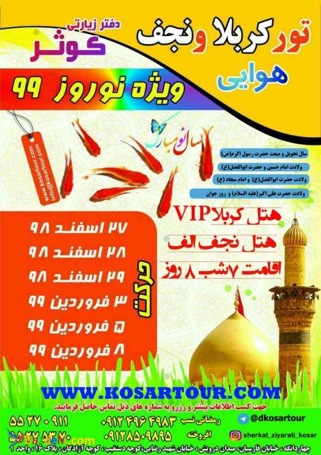 تور هوایی(7شب 8روز) دفتر زیارتی کوثر اقامتی خاطر انگیز در هتل vip در کربلا (5شب) هتل درجه الف در نجف اشرف(2شب) ترانسفر فرودگاهی گشت زیارتهای دوره صبحانه،نهار،شام همراه با سرو میوه عوارض خروج از کشور به عهده مسافر میباشد عوارض ورودی نجف به عهده مسافر میباشد استفاده از کادری مجرب در عراق همراهی مدیران و مداحان برجسته (این مجموعه کفیت را فدای کمیت نمیکند) اجرایی متفاوت و بیاد ماندنی 02155270911 02155275370. 09124964983 09128509895