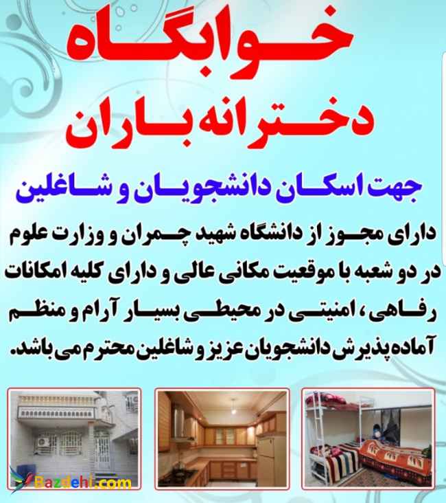 خوابگاه دخترانه باران اهواز در ۲ شعبه ((امانیه،فلکه ساعت و شهرک دانشگاه))دارای مجوز از دانشگاه شهیدچمران .با امکانات رفاهی،اسایشی در محیطی امن و تمیز به همراه سرپرستان شبانه روزی اماده پذیرش شاغلین،دانشجویان ،کاراموزان و کارمندان محترم جهت اقامت طولانی مدت و کوتاه مدت می باشد. اتاقهای ۱ و ۲ و۳ و۴و۵و۶و۸ تخته شمارهای تماس:09166064697 *** 09380477225