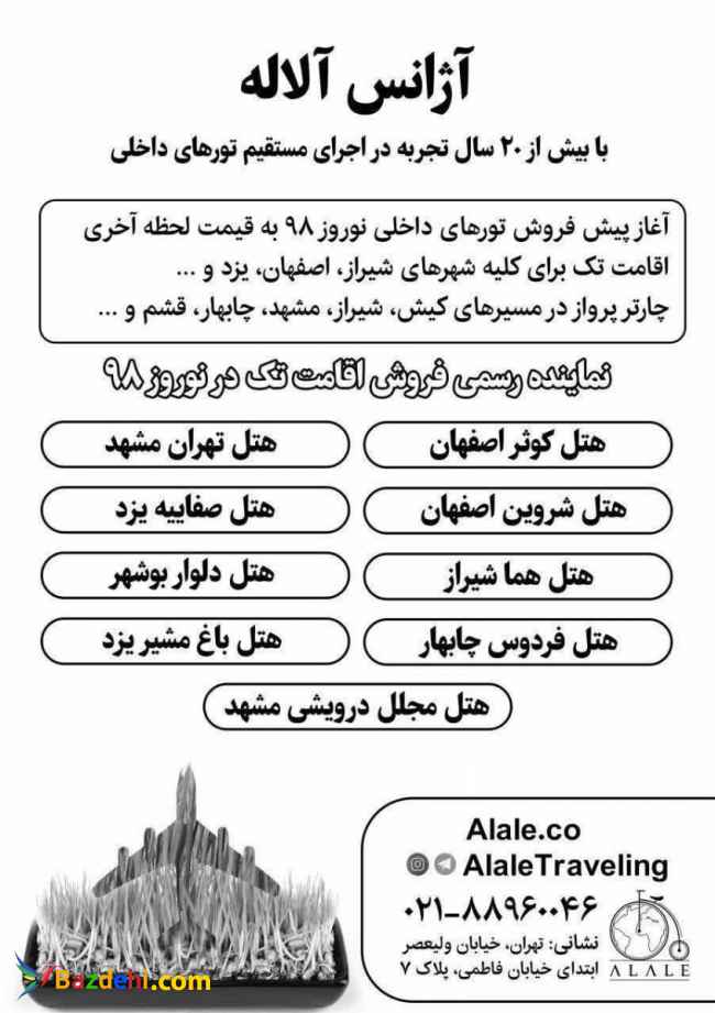 آژانس مسافرتی آلاله آسمان آبی آفر نوروزی ۹۸ تور باکو 1.990.000 تومان تور ارمنستان 1.990.000 تومان تور شیراز هتل هما ۲.۱۰۰.۰۰۰ تومان کارگزار مستقیم ویزای چین ژاپن اکراین شنگن تور آنتالیا پرواز مستقیم ۵.۷۵۰.۰۰۰ تومان تور استانبول ۳.۴۲۰.۰۰۰ تومان تور دبی پرواز ماهان ۴.۳۹۰.۰۰۰ تومان دعوت از میهمانان خارجی شما (ویزای ایران) چارتر کننده مستقیم آژانس مسافرتی آلاله آسمان آبی دارای خدمات گردشگری متفاوت و کامل نظیر فروش تورهای داخلی و خارجی، فروش بلیطهای سیستمی و چارتری در مسیرهای داخلی و خارجی، فروش بلیط قطار و کشتی، اخذ انواع ویزا و همچنین ارائه بیمههای مسافرتی میباشد. یکی از تخصصهای مهم آژانس آلاله آسمان آبی اخذ انواع ویزاها برای مشتریان میباشد و به جرات میتوان این شرکت را یکی از برترین و متخصصترین شرکتهای حال حاضر در زمینهی اخذ ویزا دانست. از اواخر سال ۱۳۹۴، این شرکت اقدام به تاسیس وبسایت جدید تحت عنوان آلاله با نام اختصاری Alale نمود که هدف از راهاندازی این وبسایت فروش خدمات مسافرتی به صورت کاملا آنلاین و سیستمی و بدون نیاز به حضور مشتری در آژانس بوده است و با توجه به دارا بودن مجوز بند الف، این شرکت با تعدادی از ایرلاینهای کشور وارد مذاکره شده و امتیاز فروش آنلاین بلیطهای سیستمی به قیمت مصوب و حتی با قیمت کمتر از قیمت مصوب را دریافت کرده است. امیدواریم این سامانهی اینترنتی علاوه بر کمک به شما در کسب اطلاعات لازم از آژانس آلاله و همچنین اطلاعات مورد نیاز توریستی، این افتخار را کسب کند تا شما بزرگواران بتوانید با خیال آسوده در هر ساعت از شبانهروز خدمات مورد نیاز خود را به صورت مستقیم و آنلاین خریداری کنید و از سفر خود لذت ببرید. خیابان ولیعصر - ابتدای خیابان فاطمی - پلاک 7 تلفن تماس 02188960046 09905287400 سایت:https://www.alale.co/ تلگرام:https://t.me/alaletraveling اینستاگرام:https://www.instagram.com/alaletraveling تور زمینی باکو تور نوروزی داخلی تور زمینی ارمنستان تور نوروزی شیراز ویزای چین تور نوروزی آنتالیا تور نوروزی استانبول ویزای ایران تور نوروی دبی بلیت ارزان تور ارزان خارجی آفر زمینی باکو آفر لحظه اخری باکو آفر تور ارمنستان تور نوروزی داخلی هتل ارزان باکو هتل ارزان شیراز هتل همای شیراز ویزای اکراین شنگن تور ژاپن تور هوایی بلاروس هتل ارمنستان خدمات ویزا در ایران ویزای بلاروس ویزای تضمینی چین کارگزار مستقیم ویزای چین سفر با باکو بلیت ارزان باکو تور زمینی ارزان لحظه آخری تور مشهد نرخ ارزان تور کیش تور شیراز هوایی سفر به شیراز چارتر پرواز اقامت تک هتل تور یزد تور اصفهان هتل اصفهان تور چابهار هتل فردوس چابهار هتل باغ مشیر یزد هتل صفاییه یزد هتل تعطیلات کیش نرخ نوروزی هتل نرخ ارزان بلیت هواپیما رزرو بلیت هواپیما بلیط هواپیما