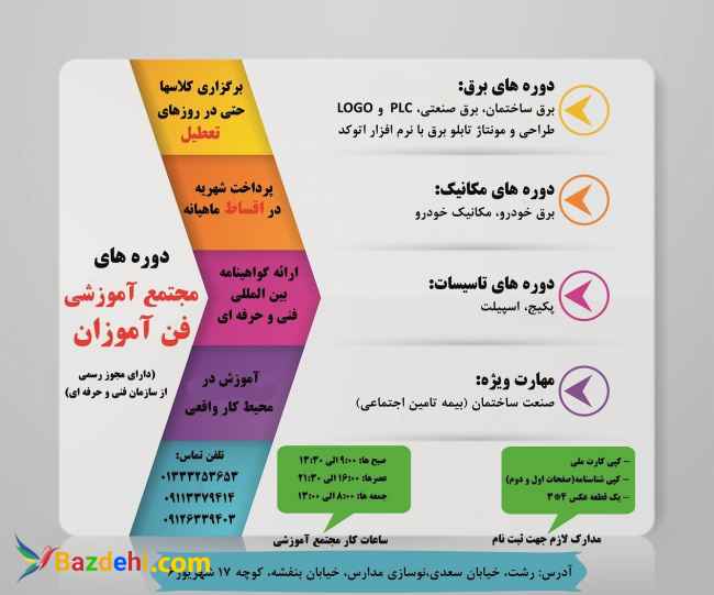 مجتمع آموزشی فن آموزان، برای راحتی کارکنان و شاغلین، آمادگی خود را جهت برگزاری دوره های فنی برق و تاسیسات با ارائه مهارت فنی و حرفه ای در ایام هفته حتی روزهای تعطیل اعلام می دارد. این دوره ها شامل: دوره های برق صنعتی، برق ساختمان، سیستم ارتینگ(زمین)، ایمنی در برق، برق خودرو و تاسیسات، مونتاژ تابلوهای صنعتی و ساختمان، تابلوهای ترافیک شهری، طراحی تابلو برق با نرم افزار اتوکد الکتریکال و PLCمی باشد. با اعطای مدرک بین المللی فنی و حرفه ای دارای مجوز رسمی از سازمان فنی و حرفه ای کشور خواهشمند است جهت کسب اطلاعات بیشتر، با شماره,09126339403 , 33253653-013 تماس حاصل نمایید. ادرس: رشت، خیابان معلم، روبروی استانداری، خیابان طالقانی، طالقانی سوم، پلاک 22