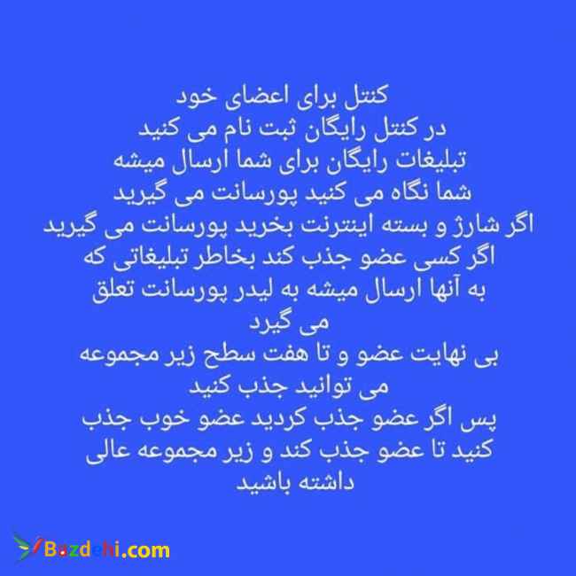 ? کنتل به زبان خودمانی ? سلام برای گوشیت پیامک تبلیغاتی میاد؟؟؟ هر کاری که کنی بازم این پیام ها برات میاد درسته؟؟ نظرت چیه برای دریافت این پیامکها پورسانت بهت تعلق بگیره؟؟ مطمعنم همه دوسدارن درآمدی هرچند ناچیز از این پیامکهایی که بیشتر اوقات اعصاب بهم ریزه دریافت کنند .ولی شما میتونین با دعوت کردن فقط ۱۰ نفر از دوستان یا خانوادتان به درآمدی خیلی عالی برسی. باور کنید این درآمد دور از انتظار نیست فقط باید خودتو باور کنی و همین الان دست به کار بشین. برای اولین بار یه طرحی اومده که کار اصلیش فرهنگ سازی در زمینه ارسال پیامک هاست و داره پیامک های تبلیغاتی رو سر و سامان میده تا کسی پیامک الکی و بی خود و نامربوط دریافت نکنه، برای این کار اصلا لازم نیست کار خاصی انجام بدی فقط کافیه از طریق لینک زیر ثبت نام کنی و اطلاعاتتو تکمیل کنی .اگر در اینجا لینک باز نشد اونو در مرورگر کپی کرده یا کپی لینک را میتوانید در تلگرام باز کرده وبه راحتی ثبت نام کنید.همچنین درپایان ثبت نام همونجا کلیک کرده و همیار را دانلود کرد ونصبش کنید. http://my.hamyar.io/account/register?link=C10192061 از اون جالب تر این که این پیام ها هیچ هزینه ای نداره و تازه کنارش یه مبلغی به عنوان پاداش همراهی هم دریافت میکنی. یعنی در ازای دریافت هر پیام اطلاع رسانی بهت پول هم میدن در کنار این پورسانت که شخصا میگیری میتونی برای افزایش درآمد تا چندین میلیون در ماه دوستان و آشنایانتو دعوت کنید که با لینک شما ثبت نام کنند تا از فعالیت اونها هم پورسانت دریافت کنید ? خب داستان از این جا شروع میشه.تو میتونی هر تعداد از دوستانت رو به این طرح معرفی کنی و اونها هم مثل خودت میان و ثبت نامشون رو تکمیل میکنن و اطلاعاتشون رو وارد میکنند. حالا وقتی برای هر کدوم از این افرادی که معرفی کردی پیامک ارسال بشه بابت هر پارت پیام شما مبلغ ۴ ریال دریافت میکنی. حالا اون دوستات هم دوستانی برای خودشون دارند و اونها رو دعوت میکنند. چرا دعوت میکنن؟؟؟ چون همه دلشون میخواد اطلاعات مورد علاقه شون مثل حراج و تخفیف و فروش ویژه رو سریع تر خبر دار بشن و از دستش ندن. اون دوستانی که شما خودت معرف کردی اصطلاحا میگن عمق اول و دوستان جدید که این دوستان معرفی کنند میشن عمق دوم.ودعوتیهایی که عمق دوم میارن برای شما میشن عمق سوم وهمچنین تا عمق هفتم دعوتیها جزو زیر مجموعه های شما هم حساب میشن وشما بابت فعالیت همه این ۷ عمق پورسانت میگیری. میخوای بدونی نحوه ثبت نام چطوریه؟! با این فرمت یه پیام بفرست به شماره 20001183 شماره موبایل معرف 09396961600 نام استان نام شهر دوستان توجه داشته باشین پس از ثبت نام با لینک بالایی یا با روش ارسال شماره معرف،نام استان،نام شهر به شماره 20001183 وسپس نصب اپلیکیشن همیار از بازار وتکمیل مشخصات کامل حتما کله on را به 20001183 بفرستید تا حساب کاربری شما فعال بشه. همین!! ? حالا بیا حساب کنیم چقدر از این داستان پول در میاد... ? فرض کن شما 10 نفر را به این طرح معرفی کنی و اونا ثبت نام خود را تکمیل کنن. اما اونا توانایی تو رو تو دعوت ندارند و هر کدوم فقط9 نفر را وارد این طرح میکنن و اونا هم هر کدوم فقط 8 نفر را ثبت نام کنند به همین ترتیب تا عمق هفتم که کل مجموعه شما بالغ بر ۷۹۲۱۰۰ نفر میشود.حال اگه برای هر نفر یه پارت پیام بیاد واز هر پارت به شما ۴ ریال پورسانت برسه مبلغی در حدود ۳۱۶۸۴۰۰ ریال به حساب سپرده تان میاد. توجه داشته باش که این مبلغ فقط و فقط برای یک پارت ارسال هست. اگر به صورت میانگین در روز حدود 5 تا 15پارت پیام ارسال بشه این مبلغ حدودا به 1.5تا 4.5 میلیون تومان می رسه و با یک محاسبه ساده در ماه حدود 45 تا 135 میلیون تومان درآمد از این طرح می تونی داشته باشی ببینید دوستان در بدترین حالت اگه شما 1 دهم این مجموعه رو داشته باشین بازم چیزی در حدود 13 میلیون ماهانه درآمد خواهید داشت وبازم اگه حتی نتونین کسی رو دعوت کنید به تنهایی با تکمیل تمام راههای درآمدی کنتل ماهانه ۱۰ تا ۸۰ هزار تومن خواهید داشت اطلاعات کامل در کانال Nov