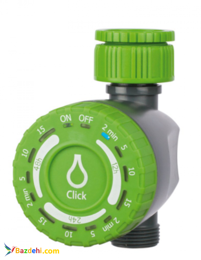 تایمر Click يكي از ساده ترين تايمرهاي Rain و روشي مطمئن و ساده جهت آبياري فضاهاي كوچك در مقياس بالكون و باغچه هاي كوچك ميباشد. در اين تايمر با فشردن يك دكمه، گزينه زمان و دور آبياري از چرخه آبياري برنامه مورد نظر را انتخاب ميكنيم.