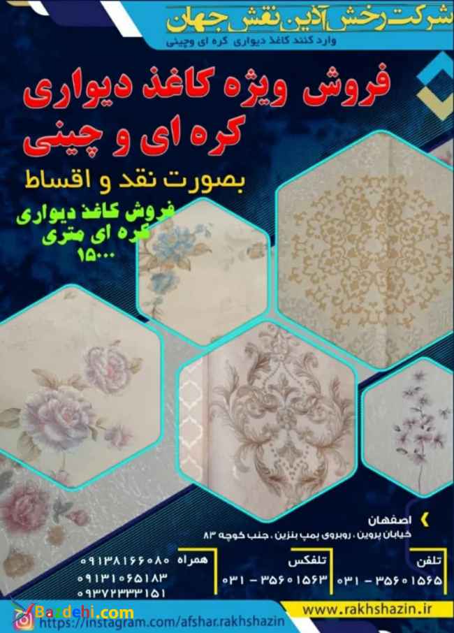 (شرکت رخش آذین نقش جهان)) واردکننده کاغذ دیواری کره ای وچینی قابل شستشوی خارجی روکش دار pvc در ایران متری 15000 ((1_کاغذ دیواری 16کره ای متری 13000=208000)) ((2_ کاغذ دیواری16کره ای متری15000=240000)) ((3_کاغذ دیواری 16کره ای متری 18000=288000)) ((4_کاغذ دیواری 16کره ای متر 20000=320000)) ((5_کاغذ دیواری16کره ای متری22000= 352000)) ((6_کاغذ دیواری16کره ای متری25000=400000)) ((7کاغذ دیواری 16کرهای متری31500=500000)) هزینه نصب 16متر متری 10000 هزار تومان رولی160000 ((فروش کاغذ دیواری 5متری چینی روکش دارpvc)) ((کاغذ دیواری های آلبوم دار روکش pvcقابل)) ((شستشو از رولی 150000تا 350000هزار تومان )) ((هزینه نصب متری 10000می باشد)) ((فروش و نصب انواع پوستر سه بعدی روکش pvc)) ((باتنوع رنگ بالا و کیفیت بالا با انواع جنس بالا)) ((چرمی_برئیان_اکسیر_نوبل_ الماسی_هلندی)) ((محصولات شرکت رخش آذین نقش جهان )) (((داری ضمانت نامه کپی شرکت می باشد))) (((((((((((بصورت نقد واقساط)))))))))) (((((((هدف ما جلب رضایت شماست)))))))