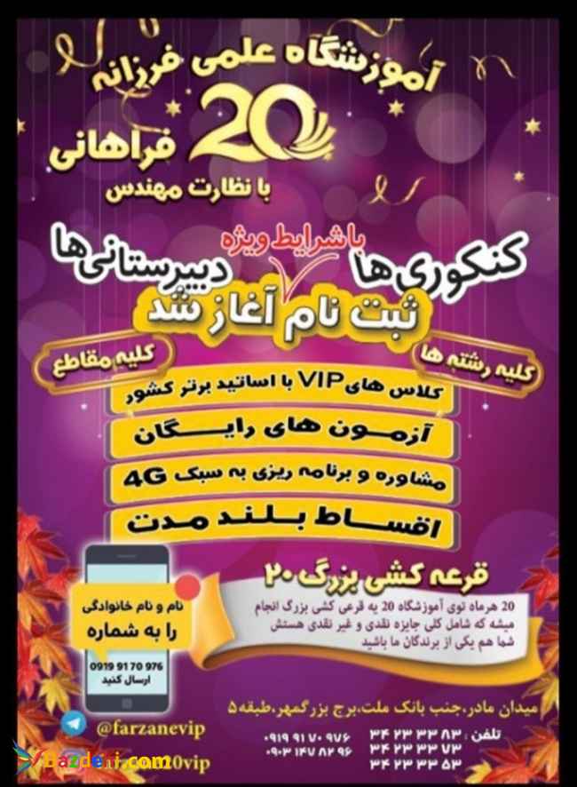 اموزشگاه علمی تقویتی فرزانه20 بانظارت مهندس فراهانی ? آموزشگاه تقویتی و کنکور ?شرایط پرداخت اقساط ?برگزاری کلاسها با اساتید برتر کنکور کشور؛ ? برگزاری آزمون‌های ازمایشی سنجش ? مشاوره و برنامه ریزی به سبک4G ?برای کسب اطلاعات بیشتر شماره09199170976 34234643 کانال تلگرام farzanevip پیج اینستاگرامfarzane20vip ? آدرس: کرج- مهرویلا میدان مادر جنب بانک ملت برج بزرگمهرط5