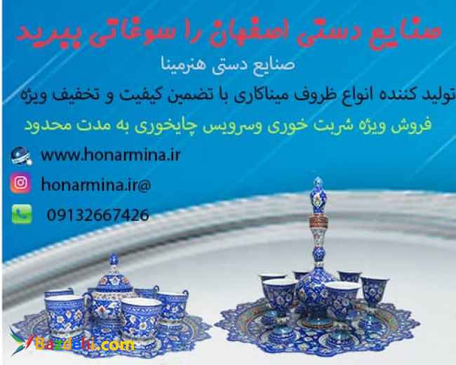 فروش ظروف میناکاری در رنگها ومدلهای مختلف با تخفیف ویژه انواع ظروف میناکاری اعم از بشقاب مینا کاری ، گلدان مینا کاری، شیرینی خوری میناکاری، کاسه وبشقاب میناکاری، گالش چایخوری میناکاری ، شربت خوری میناکاری و..... اگر قصد خرید ظروف میناکاری دارید از سایت www.honarmina.ir دیدن کنید . قبول سفارشات به صورت کلی وجزئی قبول سفارشات ارگانهای دولتی وخصوصی با تخفیف ویژه فروش شربت خوری وسرویس چایخوری با30 درصد تخفیف به مدت محدود ارسال رایگان به تمام نقاط کشور فروش ظروف میناکاری ٬ ظروف میناکاری ٬ لعاب میناکاری ٬ آموزش میناکاری ٬ گالش چایخوری میناکاری ٬ شربت خوری میناکاری ٬ انواع ظروف میناکاری ٬ظروف مینا کاری در اصفهان ٬فروش اینترنتی ظروف میناکاری ٬ تولید کننده ظروف میناکاری
