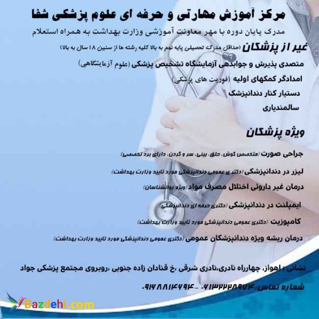 ثبت نام شروع شد مرکز آموزش مهارتی و حرفه ای علوم پزشکی شفا ویژه پزشکان و غیر از پزشکان *امدادگرکمکهای اولیه (فوریت های پزشکی) *دستیار کنار دندان پزشک *علوم آزمایشگاهی (متصدی پذیرش و جوابدهی آزمایشگاه،تشخیص پزشکی) *سالمندیاری *دارویار (تکنسین داروخانه) ویژه پزشکان جراحی صورت،لیزر در دندانپزشکی،ایمپلنت در دندانپزشکی،کامپوزیت... ((مدرک پایان دوره با مهر معاونت آموزشی وزارت بعداشت)) نشانی:اهواز_خیابان نادری شرقی خ قنادان زاده جنوبی روبروی مجتمع پزشکی جواد برای اطلاعات بیشتر با شماره درج شده تماس حاصل فرمایید. 09168814694_06132228974 آقای خسروی