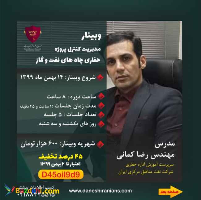 وبینار مدیریت کنترل پروژه حفاری چاه های نفت و گاز مدیریت کنترل پروژه حفاری چاه های نفت و گاز ویژه مدیران و مسئولین کلیه شرکت های فعال در حوزه نفت و گاز با تخفیف ویزه 45 درصدی- کد d450il9d9 از طریق لینک ذیل ثبت نام کنید. http://disstore.ir/?p=2261