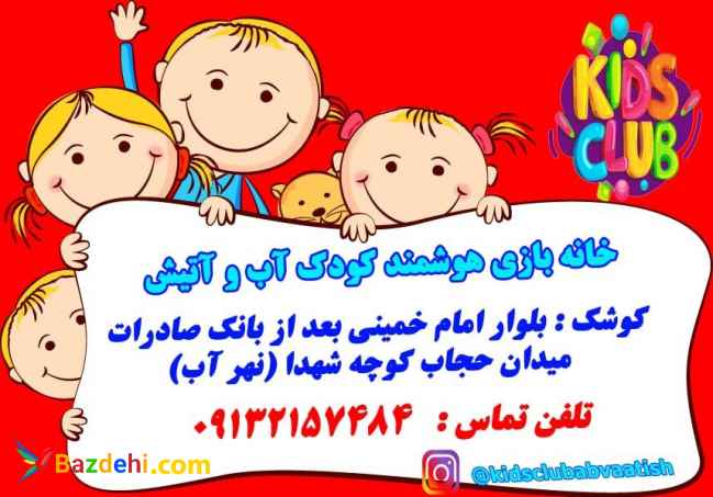 ? بچه های پرانرژی اصفهانی و خمینی شهری دعوتید به خانه بازی شاد و شیک ? آب? و آتیش ♨️ محیطی کاملا بهداشتی و ایمن مجموعه خانه بازي كودكان واقع در باغ شهر كوشك داراي امكانات عالي سرسره بادي ، ترامپولين ، ايرهاكي ، چرخ و فلك يوفا و استخر توپ و .... و تاب و سرسره و كلي امكانات ديگر ويژه نوپايان از سن يك ساله تا 10 ساله آماده همكاري با مهدهاي كودك و مدارس برگزاري كلاسهاي بازي و خلاق كوچولو برگزاري جشن هاي تولد برگزاري جشن الفبا و ... بازي و آموزش جهت دانش آموزان آدرس باغ شهر كوشك بعد از بانک صادرات ميدان حجاب تلفن تماس 09132157484 آدرس كانال تلگرام abvaatish@ پيج اينستاگرام kidsclubabvaatish@ ....... 09132157484 ⏰ساعات کاری شنبه تا پنج شنبه : 10 صبح الی ۱۳ تا ۱۷ الی ۲۲ شب روزهای تعطیل فقط عصر ها