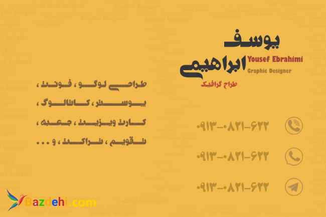 من طراح گرافیک ابراهیمی هستم در اصفهان من تبلیغ زیادی انجام نمی دهم چون باعث بی اعتمادی می شود فقط می گویم اگر کارتان را بمن بسپارید کار حرفه ای تحویل خواهید گرفت. سفارش و تحویل به صورت اینترنتی با همین شماره در واتساپ