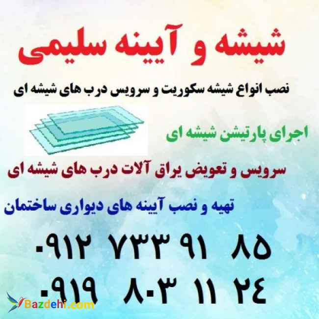 انجام پروژه های کوچک و برزگ ساختمانی و نصب و سرویس درب های شیشه ای سکوریت و نصب آیینه دیواری و تعویض یراق آلات درب های شیشه با اجناس فرانسوی و آلمانی اجرای حمام شیشه های دور دوشی و اتاقک های شیشه ای پارتیشنی و غیره… خدمات این مجموعه عبارت است از : نصب شیشه سکوریت،اجرای سقف لمینیت،تعویض ترمز درب شیشه ای،تعمیرات درب شیشه ای در محل،نصاب شیشه سکوریت در مرزداران،نصاب شیشه سکوریت در گیشا،تعویض شیشه سکوریت در گیشا،تعویض شیشه سکوریت در مرزداران،شیشه بری در شهرآرا، تعویض استوپر درب شیشه ای،تعویض ترمزگیر درب شیشه ای، شیشه بری نزدیک مرزداران،شیشه بری درگیشا،خرید شیشه سکوریت در گیشا،خرید شیشه سکوریت در ونک،خرید شیشه سکوریت در شهرآرا، اجرای سقف شیشه ای در گیشا، اجرای سقف لمینیت درمحل، تعویض لولای درب شیشه ای مرزداران،تعویض یراق آلات درب شیشه ای،ساخت درب شیشه ای در مرزداران،شیشه و آیینه مرزداران،نصب آیینه ئدیئاری در محل گیشا،نصب آیینه دیواری در گیشا،نصب آیینه دیواری ونک،نصب آیینه دیواری نزدیک فاطمی، نصب سکوریت در محل، تعویض سکوریت، فروشنده شیشه سکوریت در تهران،فروشنده شیشه سکوریت در مرزداران،نصاب ماهر شیشه سکوریت، دیوار شیشه ای، شیشه سکوریت دیواری، پارتیشن شیشه ای، اجرای پارتیشن شیشه ای، اجرای اتاق شیشه ای، نصب اتاق شیشه ای،عکس شیشه سکوریت،شرکت فروش شیشه سکوریت،شرکت طراحی شیشه سکوریت، شیشه بری سلیمی، برای مشاوره با من تماس بگیرید : 09127339185 – 09198031124 (امیر سلیمی