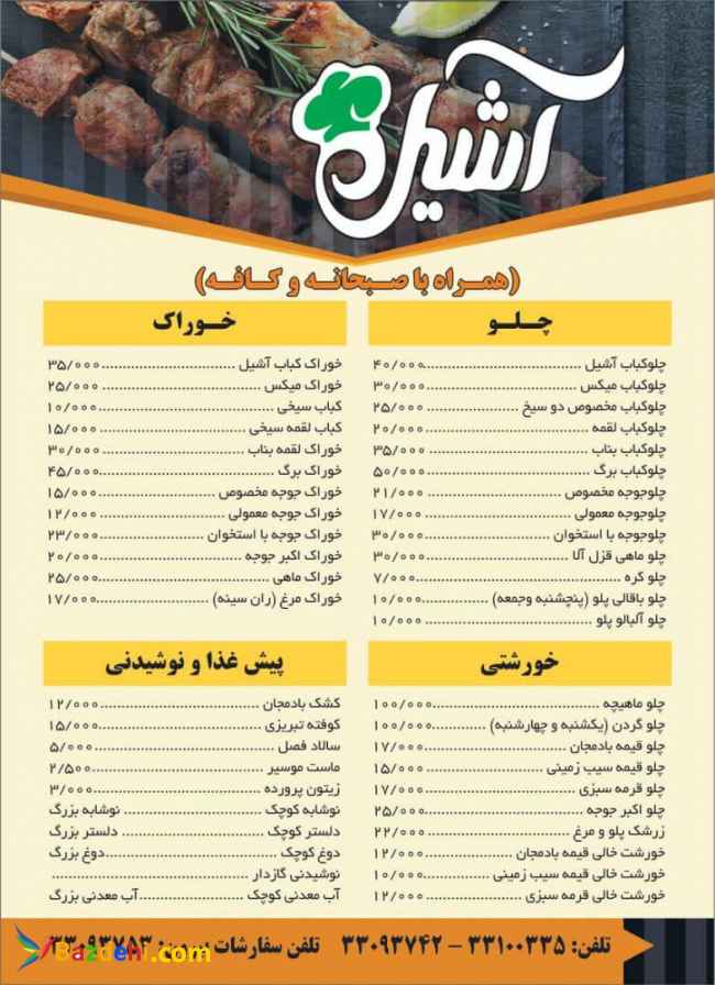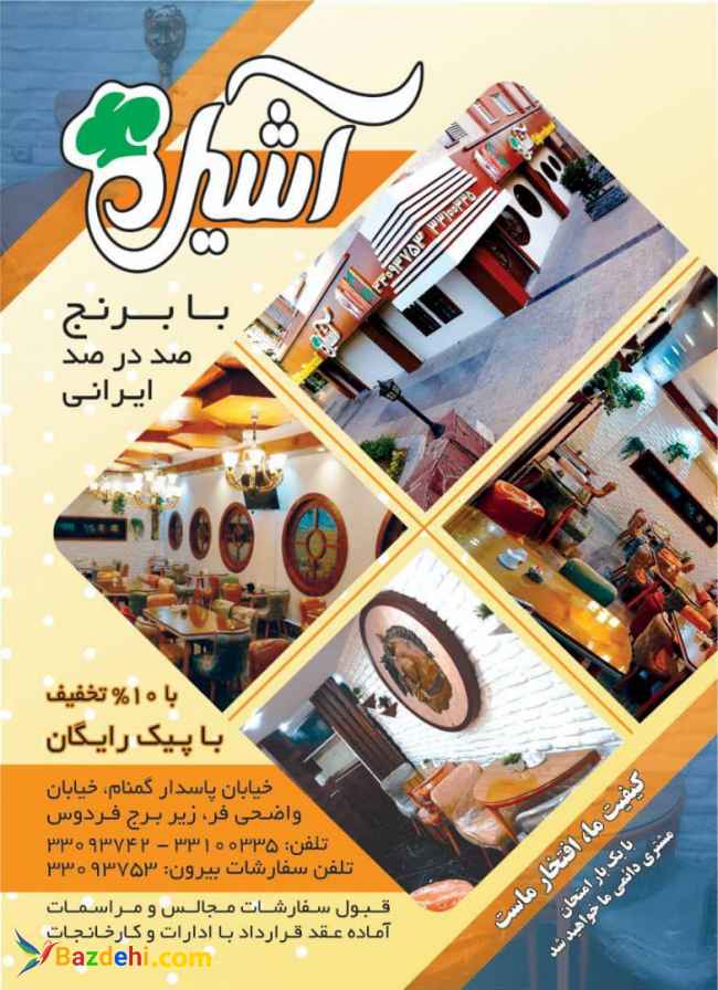 قبول سفارشات مجالس و مراسمات و آماده عقد قرارداد با ادارات و کارخانجات با برنج صددرصد ایرانی با یک بار امتحان مشتری دائمی ما خواهید شد کیفیت ما افتخار ماست (کافه رستوران آشیل) تلفن های تماس:33093753-33093742-33100335