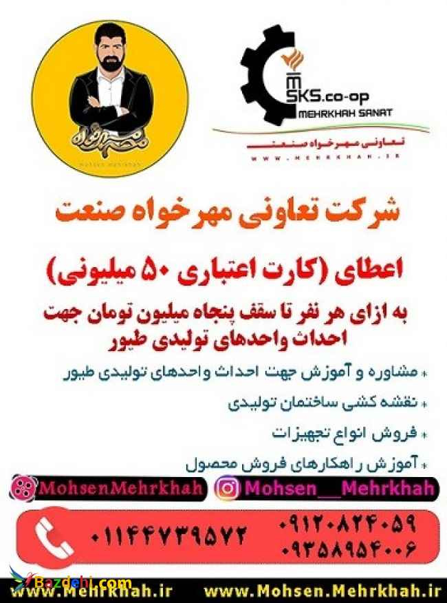 شرکت تعاوني مهرخواه صنعت کارآفرین مهندس محسن مهرخواه يکي از بزرگترين توليد کنندگان مجموعه محصولات طيور در ايران مشاوره و آموزش جهت احداث انواع واحدهای تولیدی طیور از جمله: ( بلدرچین تخم گذار و گوشتی) (مرغ تخم گذار و گوشتی بومی و صنعتی) (پرورش اردک گوشتی و تخم گذار و مسکویی) (پرورش بوقلمون گوشتی) (پرورش غاز و ....) *** اعطای تسهیلات (کارت اعتباری) به ازای هر نفر تا سقف پنجاه میلیون تومان *** با قابلیت ارسال زمینی و هوایی به سراسر کشور فروش جوجه مرغ و اردک محلی در تمامی سنین فروش جوجه بوقلمون فروش جوجه غاز فروش مرغ بارنه يا واروک – چهارونیم ماهه – 1ماه تا 20 روز قبل از تخمگذاري و مرغ تخمگذار محلی فروش جوجه خروس و خروس های آماده کشتار *** اعطای تسهیلات (کارت اعتباری) به ازای هر نفر تا سقف پنجاه میلیون تومان *** آدرس وب سايت شرکت تعاوني مهرخواه صنعت: www.Mehrkhah.ir آدرس وب سایت مهندس محسن مهرخواه www.Mohsen.Mehrkhah.ir صفحه اینستاگرام: www.instagram.com/Mohsen__Mehrkhah تلفن دريافت سفارشات: 09120824059 09358954006 01144739572