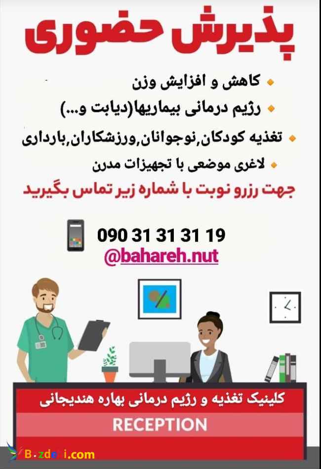 متخصص تغذیه در بلوارکشاورز کلینیک تغذیه و رژیم درمانی بهاره هندیجانی نظام پزشکی ت 224 ما همراه شما هستیم مشاوره اولیه رایگان و رزرو نوبت 09031313119 کارشناس ارشد تغذیه و رژیم درمانی (کارشناس ارشد بهداشت مواد غذایی) آنالیز وضعیت سلامتی (میزان ویتامین ،مواد معدنی ، سموم و ...) رزرو نوبت :19 31 31 31 090 آدرس مطب: تقاطع بلوار کشاورز و کار گر شمالی ،ساختمان پزشکان طلوع ،واحد 5