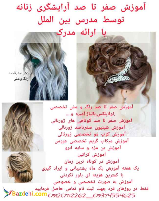 آموزش صفر تا صد آرایشگری زنانه توسط مدرس بین الملل با ارائه مدرک آموزش صفر تا صد رنگ و مش تخصصی .اولاپلکس.بالیاژ.آمبره و.... آموزش صفر تا صد کوتاهی های ژورنالی آموزش شینیون صفرتاصد ژورنالی آموزش کوپ مو تخصصی ژورنالی آموزش میکاپ گریم تخصصی عروس آموزش بن مژه و سایه ابرو آموزش کراتین آموزش در کوتاه ترین زمان یک هفته آموزش یک ماه پشتیبانی و ایراد گیری با کمترین هزینه ای باور نکردنی آموزش به صورت تخصصی و خصوصی فقط در روزهای فرد جهت ثبت نام تماس حاصل فرمایید