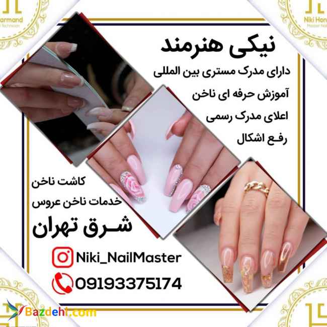 : « برگزاری دوره های آموزش کاشت ناخن با تخفیفات ویژه » * دوره های آموزش کاشت ناخن از مبتدی تا حرفه ای با اعطای مدرک رسمی * * دارای مدرک مستری از کمپانی Artex روسیه * دارای مدرک مربیگری پداگوژی از سازمان * مدرس تخصصی مورد تایید سازمان فنی وحرفه ای * برگزار کننده انواع ورکشاپ های گروهی و خصوصی ناخن * پکیج های ویژه رفع ایراد برای ناخنکاران عزیز ————— * آموزش تخصصی انواع کاشت هاى حرفه ای با جدید ترین متد روز دنیا - آموزش تخصصي دیزاین هاى ژورنالی - آموزش انواع طراحی ناخن - لمینیت ناخن و .... * آموزش به صورت کاملا تضمینی و تخصصی با تكرار و تمرين فراوان ارائه می شود و تمام زمان آموزش در اختیار هنرجو می باشد . ————— * ارائه خدمات تخصصى ناخن اعم از انواع كاشت ، ترميم ناخن و ديزاين هاى ژورنالى روز دنيا ؛ * در محیطی شیک و کاملا امن (واقع در شرق تهران) »»» دسترسی آسان از تهرانپارس - نارمک - پیروزی - افسریه و مناطق شرقی تهران ««« • [ساعت کاری ۱۰ صبح الی ۶ عصر ] ————— تصاویر آگهی ، نمونه کارهای شخصی می باشد ؛ *جهت مشاهده نمونه کارهای بیشتر به پیج زير مراجعه كنيد ؛ http://instagram.com/niki_nailmaster ————- جهت اطلاع از شرايط پكيج هاى آموزشى و تعیین وقت قبلی جهت خدمات ناخن ، فقط از ساعت ۱۰ صبح الی ۶ عصر با شماره ۰۹۱۹۳۳۷۵۱۷۴ تماس بگیرید ؛ ————- * در صورت هرگونه مزاحمت ، مراتب لازم از طریق مراجع زیربط پیگیری خواهد شد * با تشکر از شما
