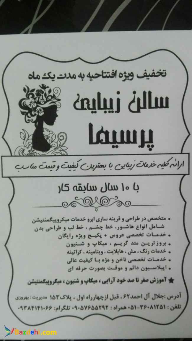 مشهد:بلوار جلال آل احمد جلال 62 پلاک 153 زیبایی پرسیما ق