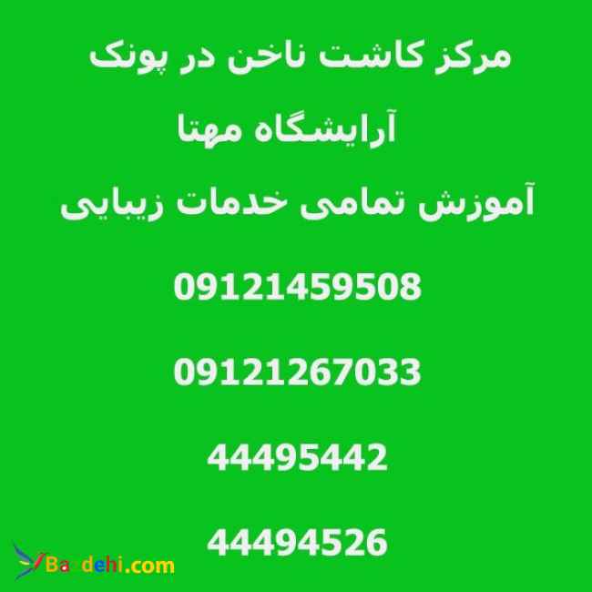 مرکز کاشت ناخن در پونک مرکز کاشت ناخن مهتا در پونک 09121459508 انواع مدل کاشت ناخن 1- کاشت ناخن ژله ای 2- کاشت ناخن پودری:پودر کاشت کریستالی::پودر کاشت پینک یا صورتی::پودر کاشت کاور یا پوشاننده::پودر کاشت رنگی کاشت ناخن با فرمر::کاشت ناخن گریم::کاشت ناخن با قالب:: کاشت ناخن بیبی بومر::کاشت ناخن کروم آموزش تمامی خدمات زیبایی آدرس:پونك - ميرزابابايي - عدل شمالى - برج نگين - جنب اتو كلاسيك - سالن مهتا 09121459508 09121267033 44495442 44494526